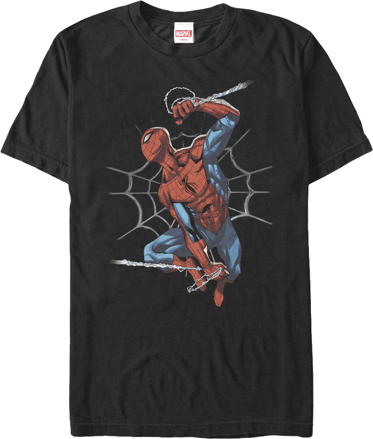 This Spider-Man t-shirt shows the amazing hero swinging from his spider webbing, which he creates with his Web-Shooters.