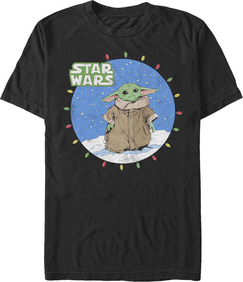 The Star Wars franchise has introduced many memorable characters, but none as cute as "The Child". This character is a 50-year old infant with the power of a Jedi and looks like a baby Yoda. Let everyone know you are a fan when you wear this The Child Christmas Lights Circle The Mandalorian Star Wars T-Shirt!