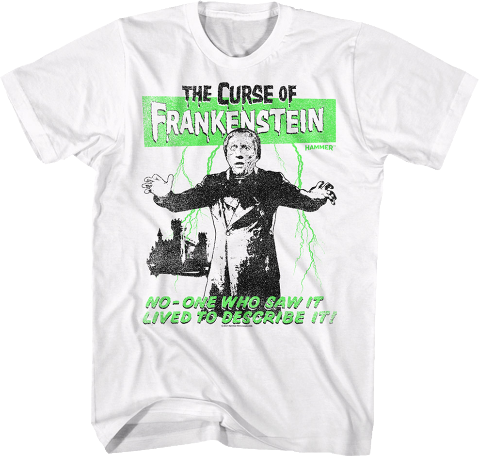 This Frankenstein t-shirt features a vintage poster for the 1957 Hammer horror film The Curse Of Frankenstein. The shirt includes the tagline, "No-One Who Saw It Lived To Describe It!"