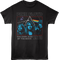 This Pink Floyd t-shirt shows the prism and spectrum from the cover artwork from the album The Dark Side of the Moon and the band members David Gilmour, Nick Mason, Richard Wright, and Roger Waters.