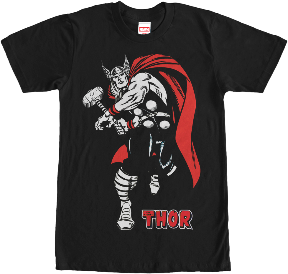 This The Mighty Thor Marvel Comics T-Shirt shows the Asgardian god with his trusty hammer, Mjolnir. Since his debut in 1962, Thor has consistently remained one of the most popular characters in the pages of Marvel comics. Thor is instantly recognizable on this t-shirt with his trademark hammer, cape, and helmet.