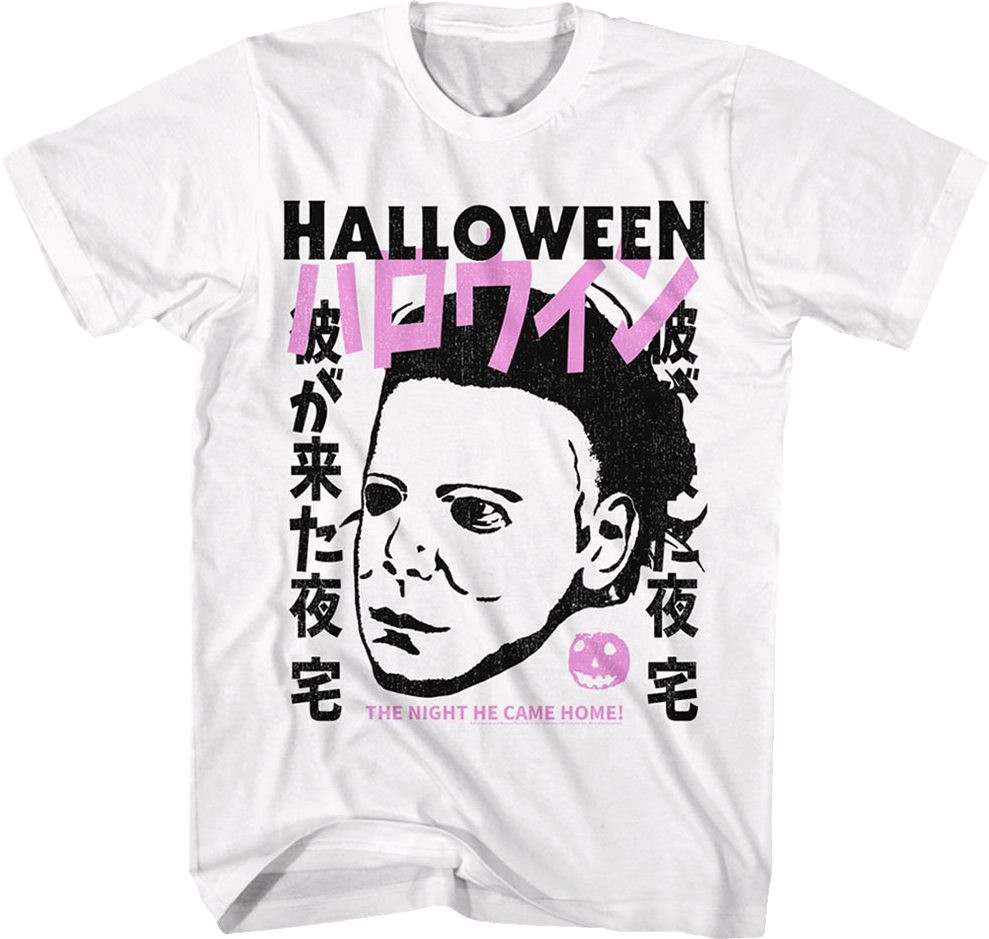 This Halloween t-shirt features Michael Myers' iconic mask and the movie's title in Japanese text. The shirt includes the Halloween tagline, "The Night He Came Home!"