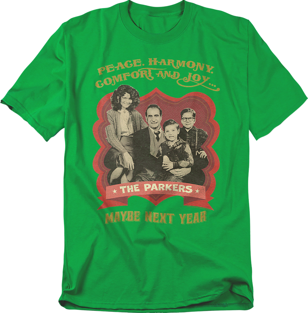 This Christmas Story t-shirt shows the Parker family posing for a family photo. The shirt reads Peace, Harmony, Comfort And Joy...Maybe Next Year.