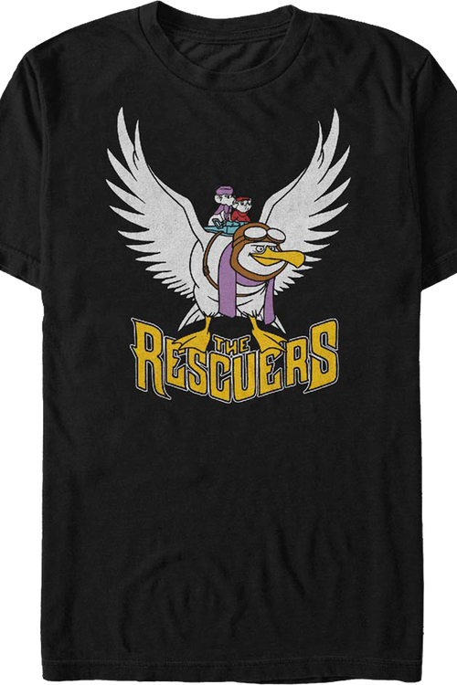 This Disney t-shirt shows the Rescue Aid Society representatives Bernard and Miss Bianca riding on the albatross Orville.