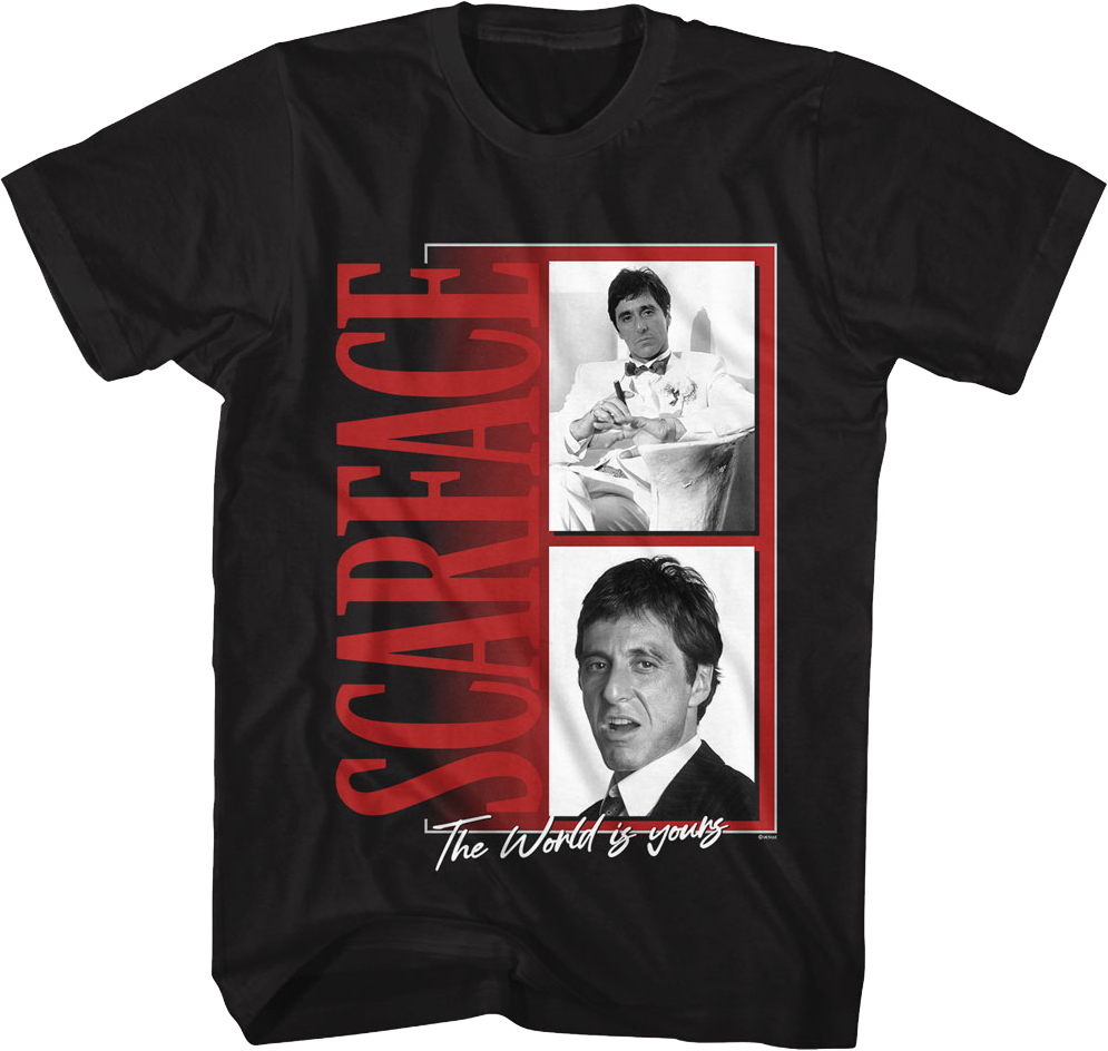 This Scarface t-shirt features black and white images of Tony Montana. The shirt includes the quote "The world is yours".