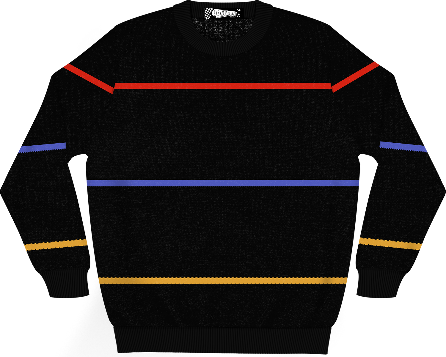 In the 1980s, the Theo Stripe design was popular because it fit perfectly with the era’s love for bold geometric graphics, color blocking, and futuristic energy. Everyone will know you are a fan of the ultra cool look when you wear this 80sTees.com exclusive Theo Stripe Design Knitted Sweater!