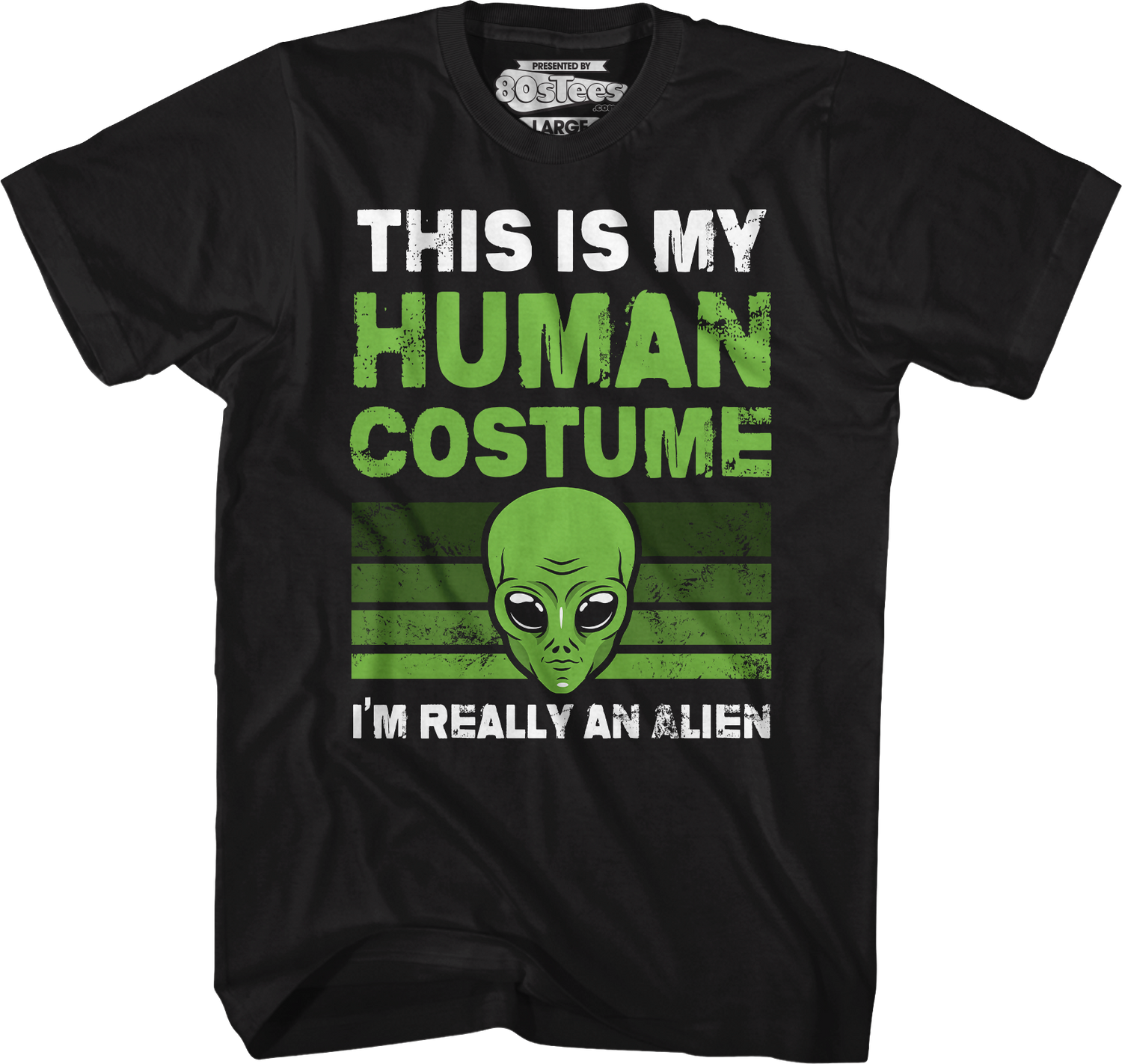 This 80sTees.com exclusive t-shirt features a green alien and reads "This Is My Human Costume" and "I'm Really An Alien".