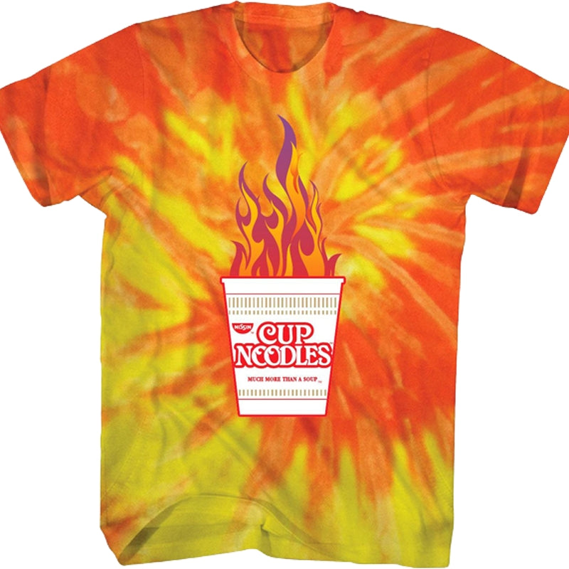 This Cup Noodles t-shirt shows a flaming cup on a colorful tie dye design.