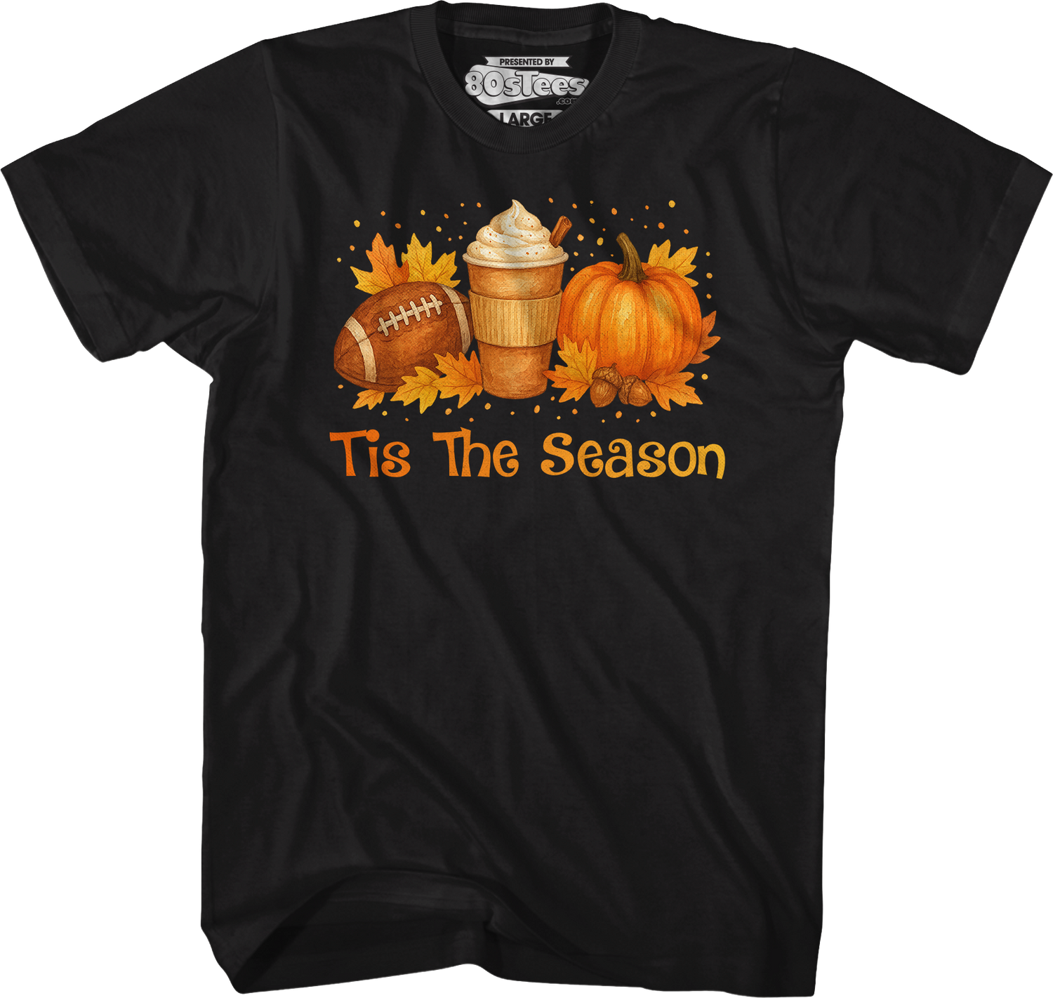 This 80sTees.com exclusive t-shirt shows Fall leaves, acorns, a football, a Cinnamon Dolce Latte, and a pumpkin. The shirt reads Tis The Season.