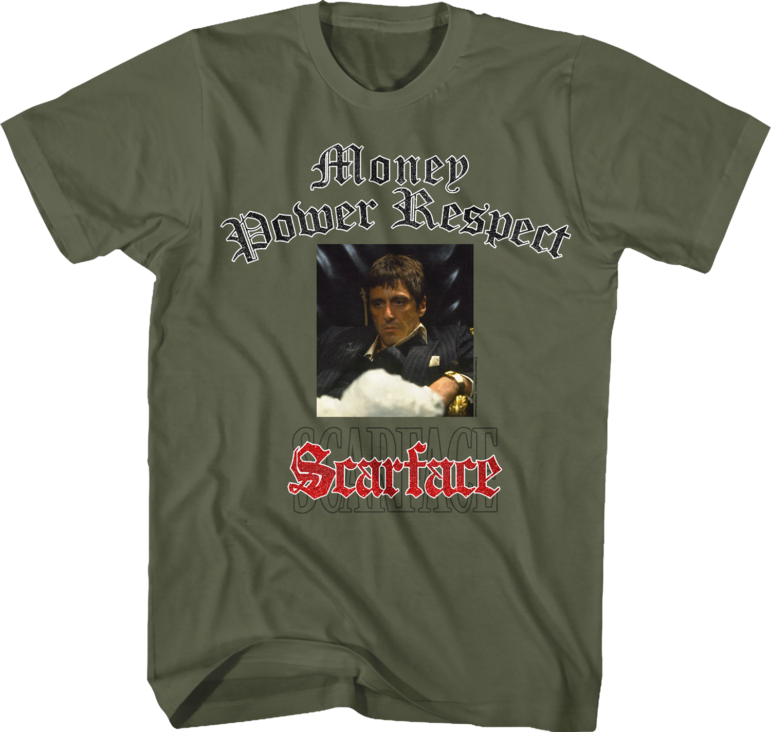 Under Brian De Palma's direction, Al Pacino made Tony Montana one of the most memorable characters in cinematic history. Now, you can show that you are a fan with this Tony Montana Money Power Respect Scarface T-Shirt!