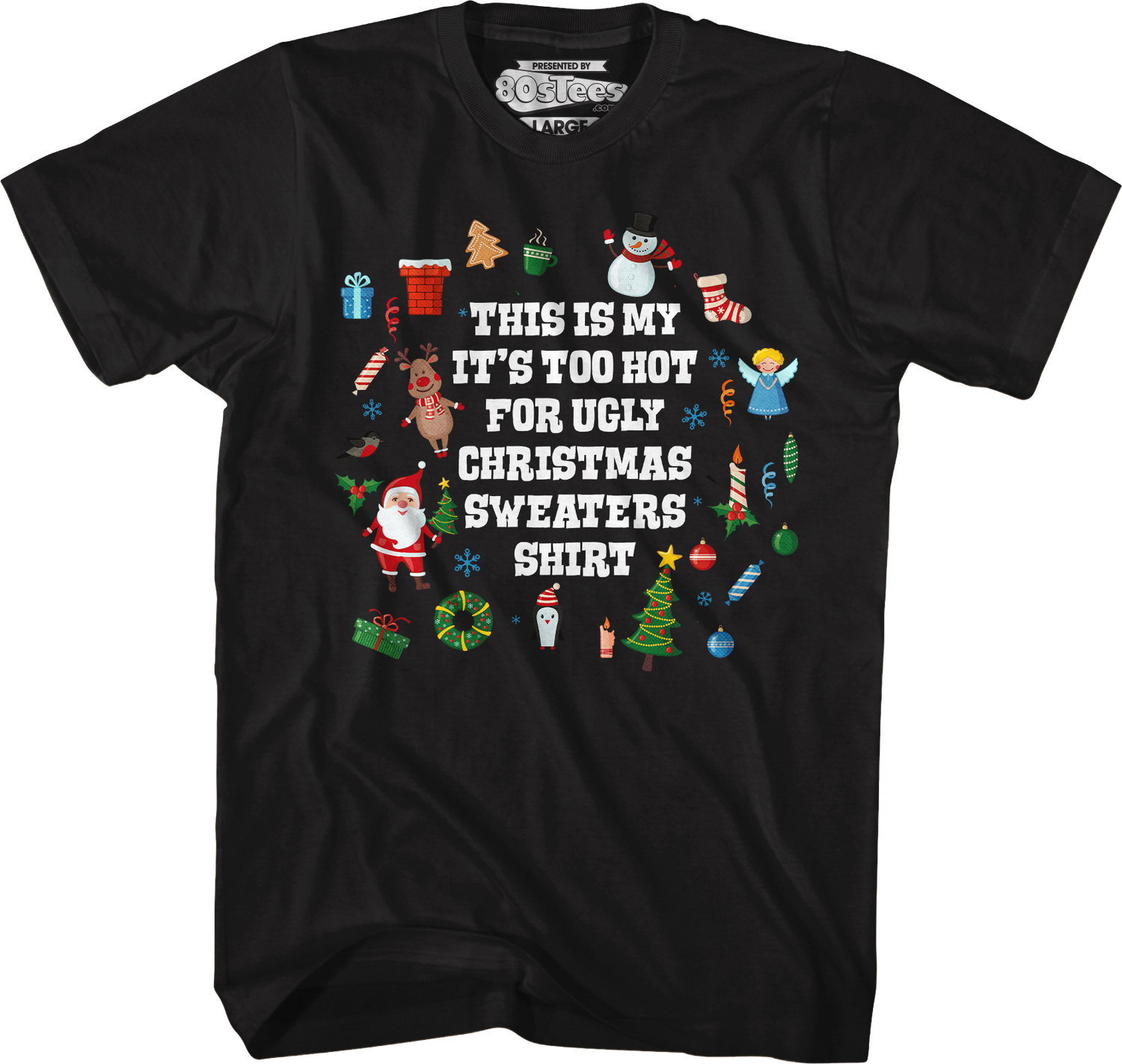 Ugly Christmas sweaters embrace over-the-top colors and designs. Wearing an ugly sweater shows you’re not taking things too seriously during the Christmas season. The only problem is it can be too hot to wear sweaters during the season. You can have the same amount of fun at Christmas parties with this 80sTees.com exclusive Too Hot For Ugly Christmas Sweaters T-Shirt!