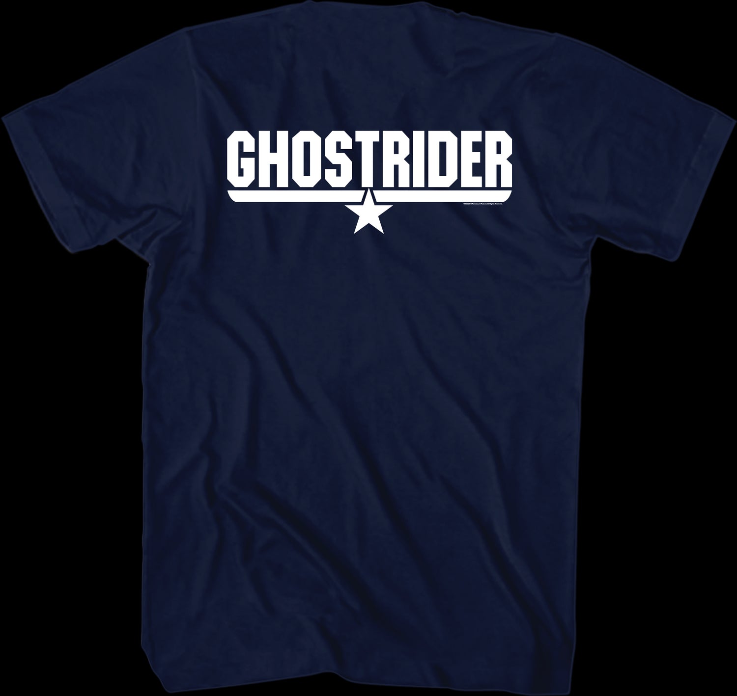 This Top Gun shirt features the movie logo on the front with the call name of "Ghostrider" on the back. Everyone will know that you are a fan of the Tom Cruise movie Top Gun each time you wear this Ghostrider t-shirt.
