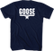 This Top Gun shirt has on the front of the shirt features the Top Gun logo. The back of the shirt has a print of the word "Goose", who was Tom Cruise's wingman in Top Gun.