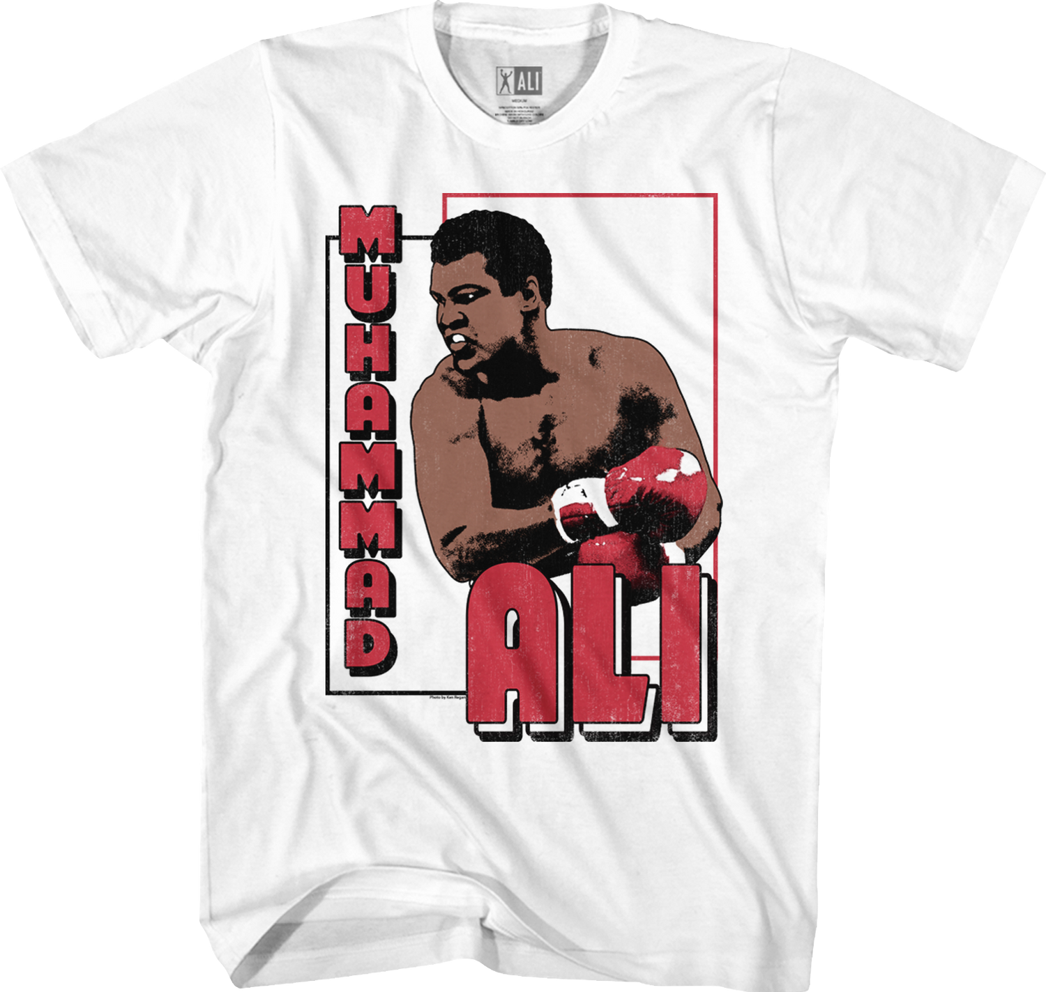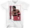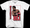 This Muhammad Ali t-shirt is designed to look like a trading card for the legendary boxer. The front of the shirt shows shows an image of Ali throwing a knockout punch. The back of the shirt shows statistics including height, weight, career record and championship reigns.
