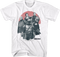 This Star Wars t-shirt features a collage of characters that appeared in The Mandalorian season two episode titled "The Tragedy". The shirt shows Din Djarin, Migs Mayfeld, Cara Dune, Fennec Shand, and Boba Fett.