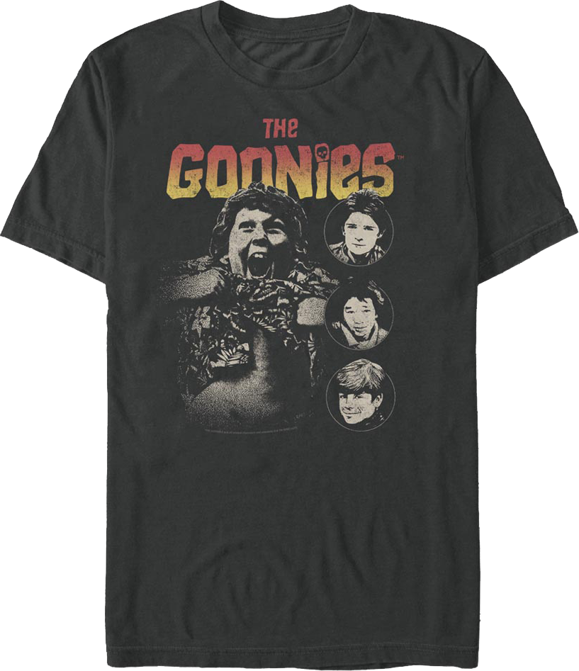 This Goonies shows Chunk doing his Truffle Shuffle dance and the faces of Chunk's friends Mouth, Data, and Mikey.