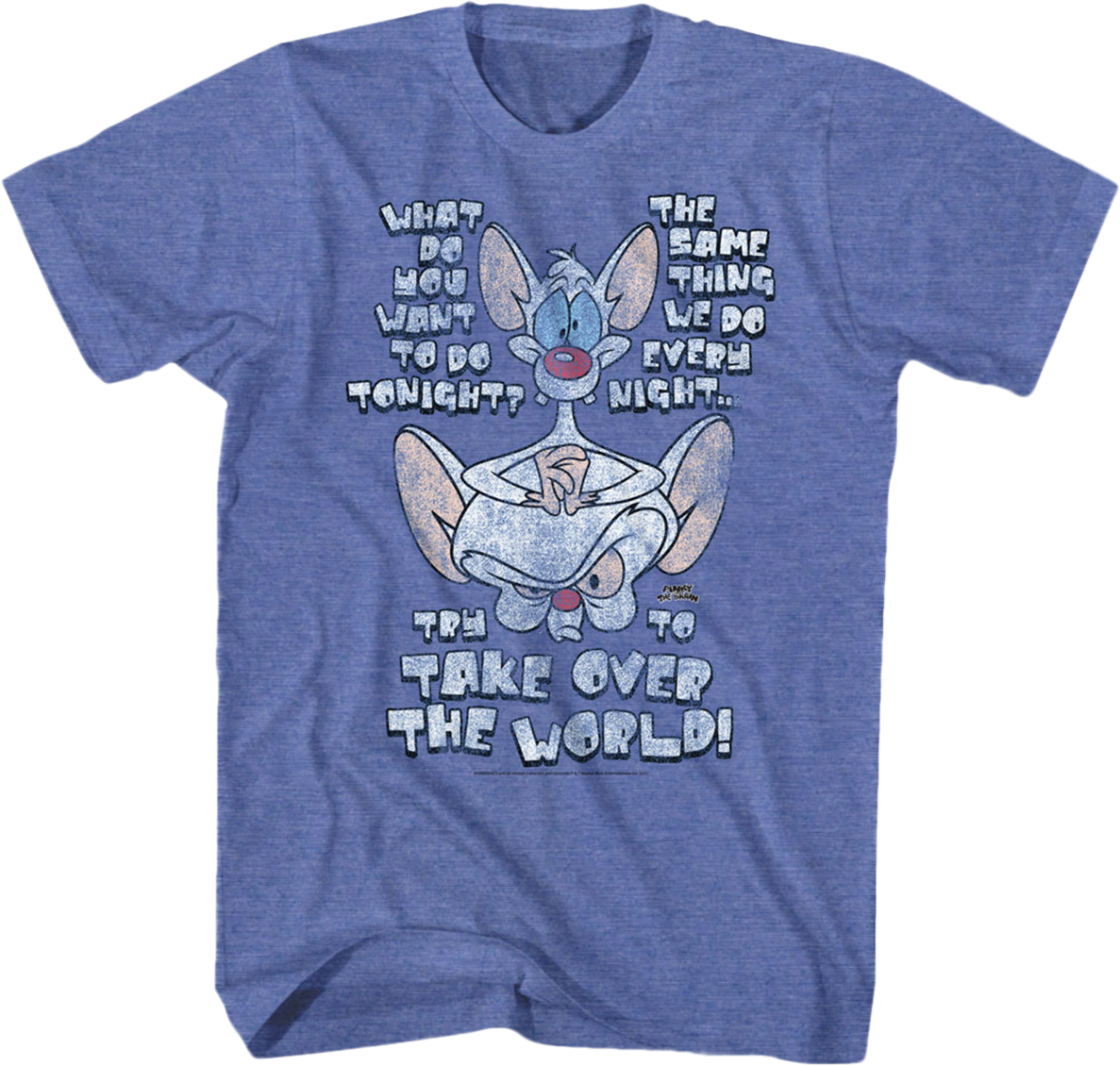 This Animaniacs Pinky and the Brain shirt shows Pinky asking the same question he asked every episode: "What are we going to do tonight?". As always, The Brain answers, "The same thing we do every night: Try to take over the world." At least they're consistent. NARF!