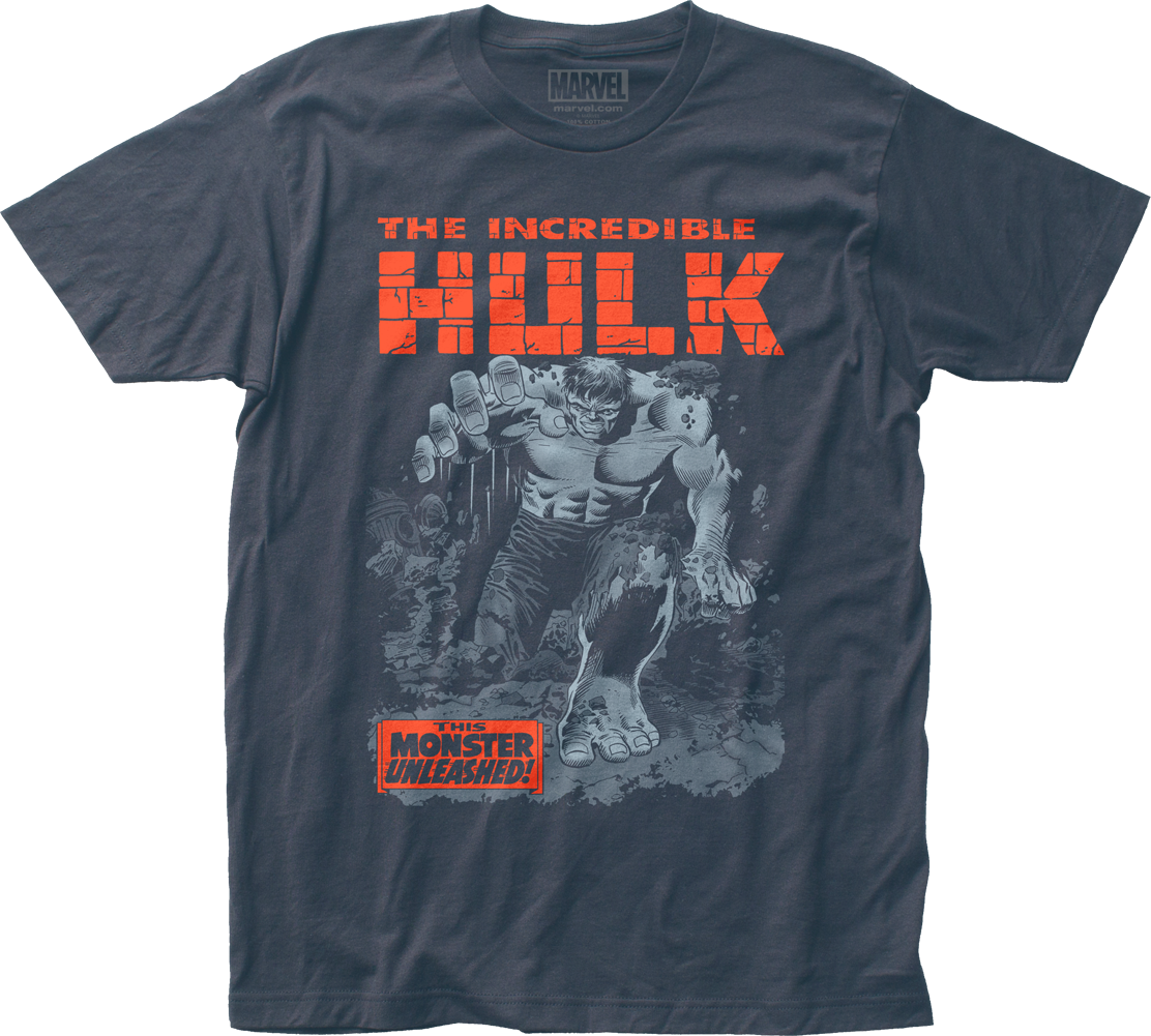 This Unleashed Incredible Hulk T-Shirt shows the cover art for the collection book featuring the Marvel monster. Doctor Bruce Banner has genius-level intelligence as well as a bit of a touchy temper. As the World Breaker, he has shown his massive strength by holding the tectonic plates of a planet together and smashed crushing Adamantium with his bare hands.