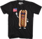 This 80sTees.com exclusive t-shirt shows a hotdog wearing star-shaped sunglasses and waving an American flag.