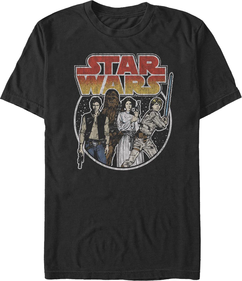 This Star Wars t-shirt features an image of the heroic characters Han Solo, Chewbacca, Princess Leia, and Luke Skywalker.