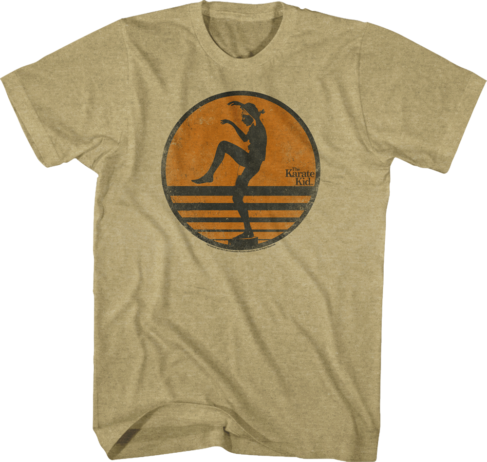 This Karate Kid t-shirt features a silhouette of Daniel LaRusso practicing the crane kick on a beach.