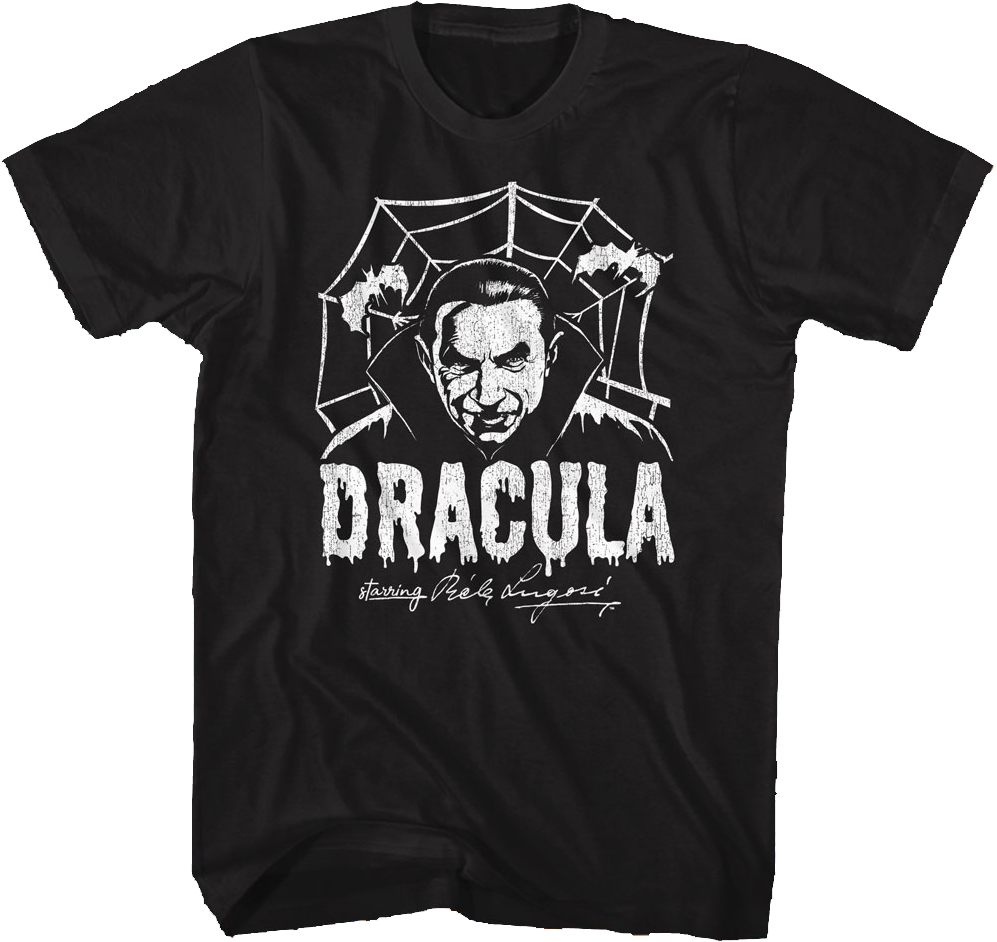 This Bela Lugosi t-shirt shows the legendary actor as Dracula posing in front of a spiderweb.