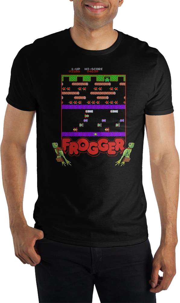 This Frogger t-shirt shows a screen shot of the classic video game. The screen shot shows a frog at the bottom of the screen, preparing to return to its frog home by crossing a busy road and navigating a river full of hazards. Frogger is one of the most popular video games of all time, and now you can show that you are a fan with this Vintage Frogger T-Shirt!