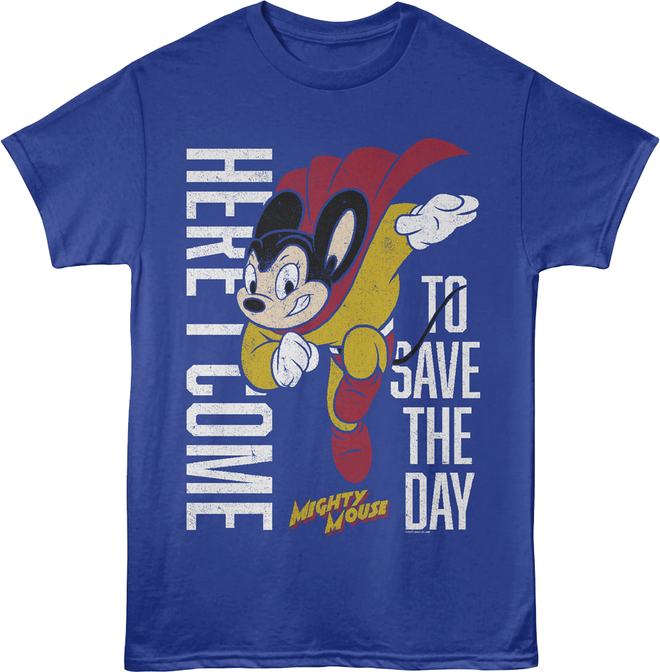This Mighty Mouse t-shirt shows Mighty Mouse ready to fly into action. The shirt reads Here I Come To Save The Day.
