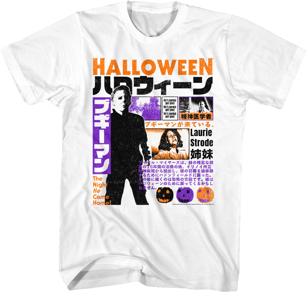 This Halloween t-shirt features a Japanese poster for John Carpenter's 1978 classic. The poster includes images of Michael Myers, Dr. Looms, and Laurie Strode. The shirt also includes the tagline "The Night He Came Home!" and the movie title in Japanese text.