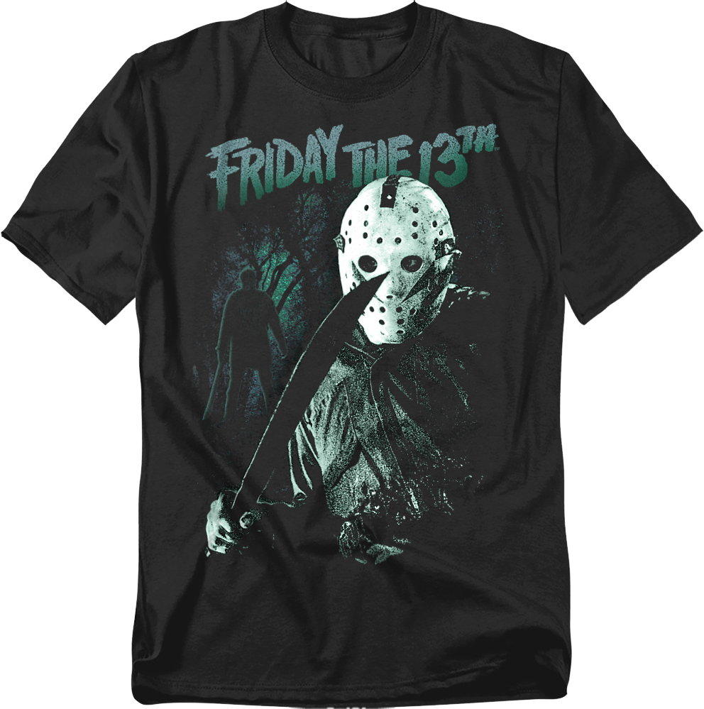 This Friday the 13th t-shirt shows Jason Voorhees posing with a machete and Jason's silhouette.