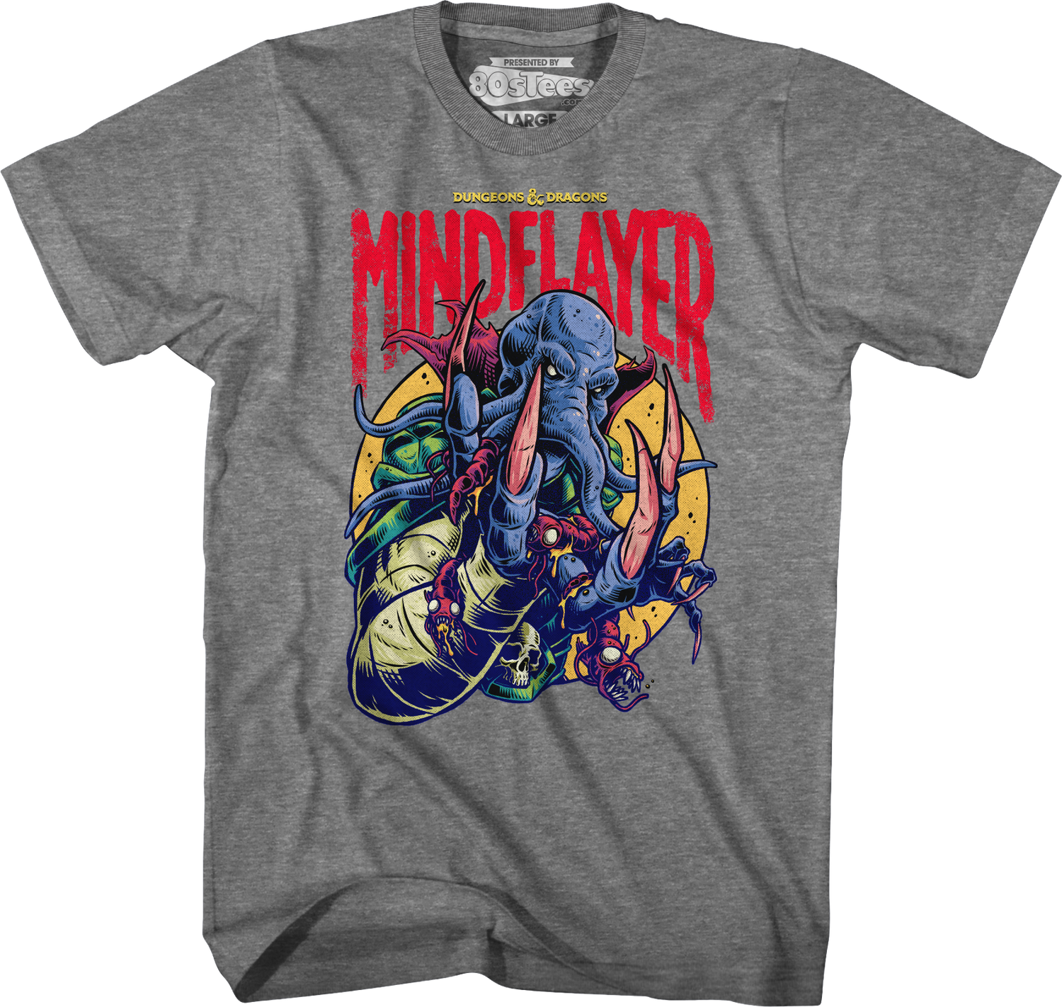 The Mind Flayer is a cruel, insidious, and evil creature from the Underdark that uses its tentacled mouth to suck out and consume humanoid brains. It views itself as a mastermind, controlling, harvesting, and twisting the potential of other creatures to further its evil and far-reaching goals. The Mind Flayer is an original invention of D&D creator Gary Gygax, and it has remained one of the most popular characters in Dungeons & Dragons. Let everyone know you are a fan with this 80sTees.com exclusive Vintage Mind Flayer Dungeons & Dragons T-Shirt!