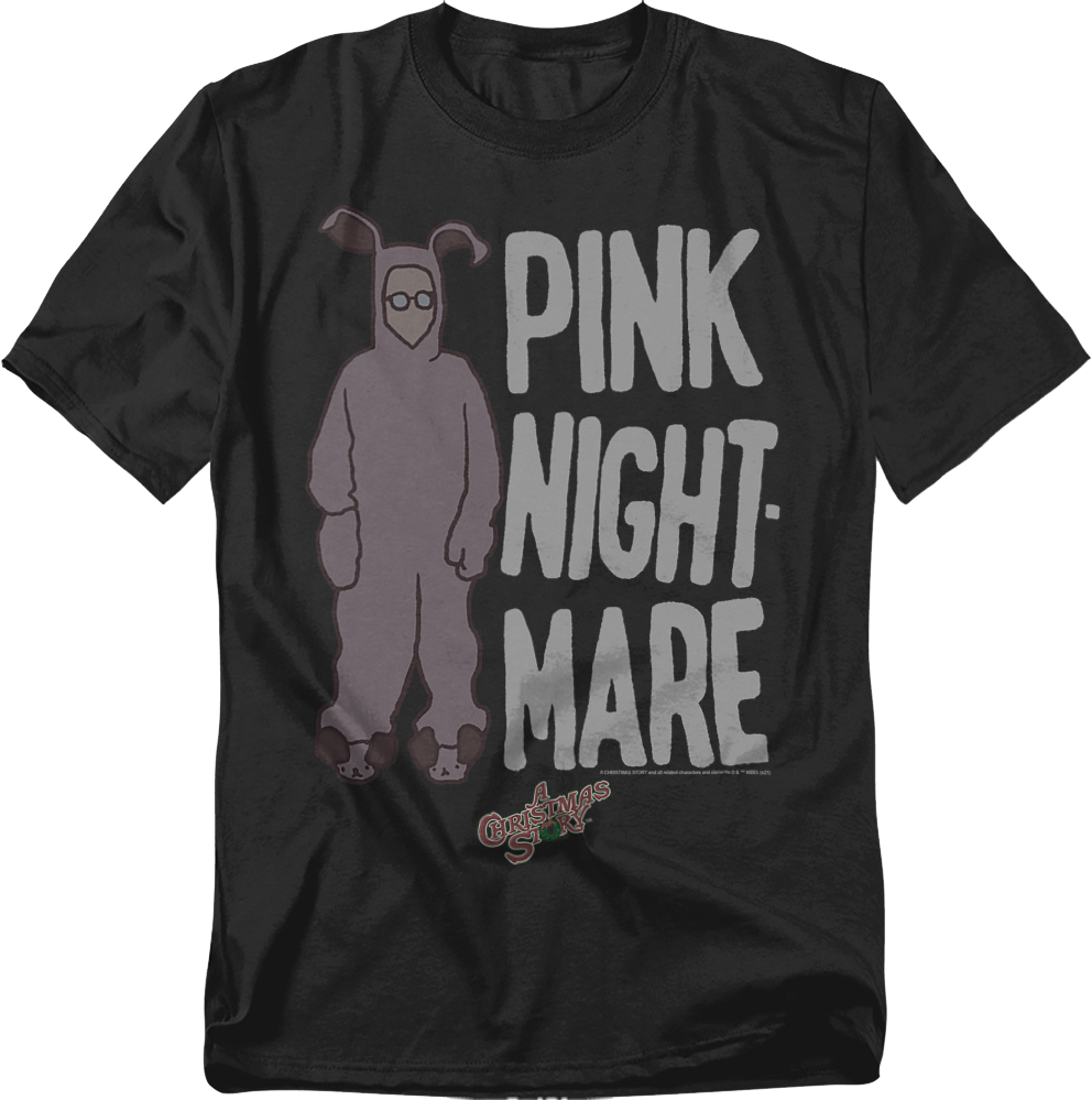 This Christmas Story t-shirt features an illustration of Ralphie Parker wearing the pink bunny outfit that his Aunt Clara made for him. The shirt reads Pink Nightmare.