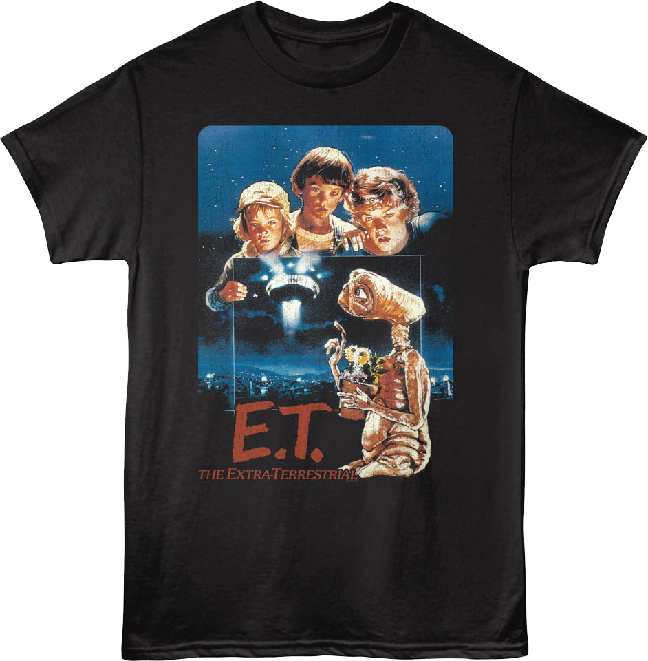 E.T. is regarded as one of the greatest movies in cinematic history, and everyone will immediately know you are a fan of Steven Spielberg's 1982 classic when you wear this Vintage Poster E.T. The Extra-Terrestrial T-Shirt!