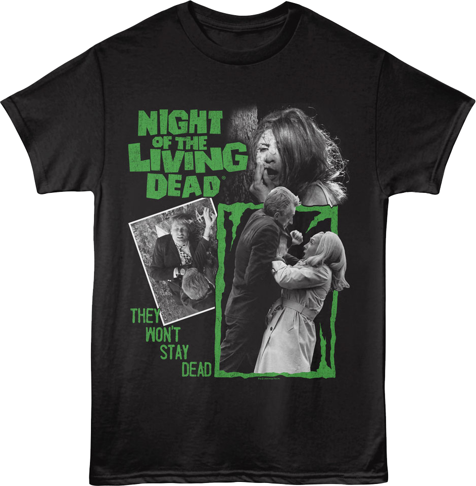 Night Of The Living Dead follows a group of strangers trapped in a rural farmhouse as they try to survive an outbreak of reanimated corpses that crave human flesh. George A. Romero's 1968 classic revolutionized the horror genre, setting the foundation for all future zombie films and pop culture depictions of the undead. Everyone will know you are a fan when you wear this Vintage They Won't Stay Dead Night Of The Living Dead T-Shirt!
