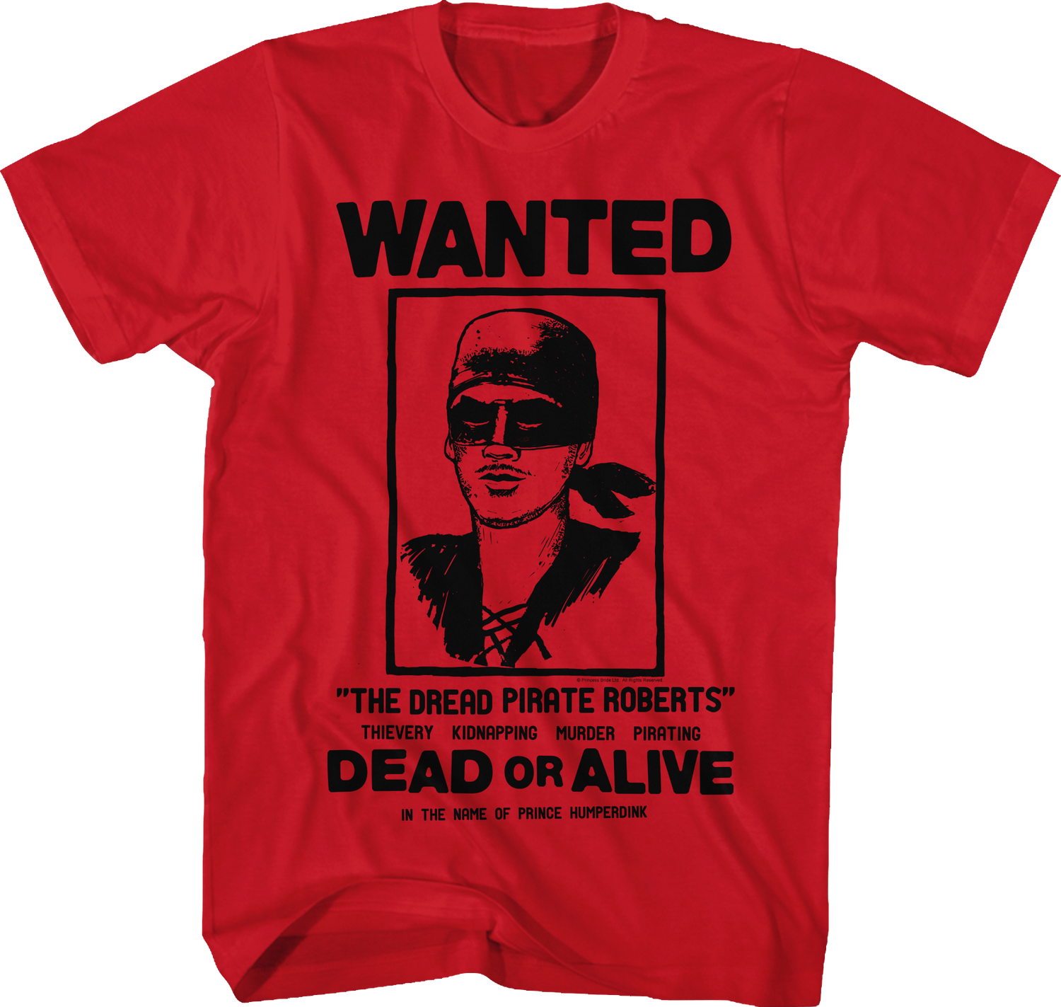 This Princess Bride t-shirt features a wanted poster for "The Dread Pirate Roberts", wanted in the name of Prince Humperdink.