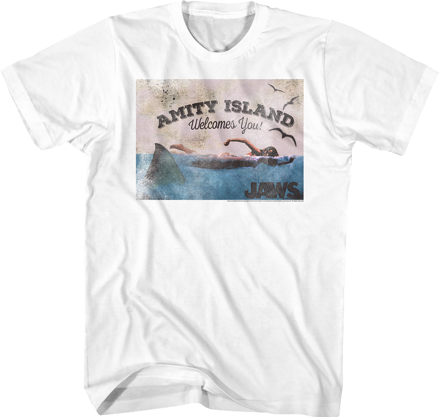 Jaws has appeared on countless lists of the greatest movies of all time. Everyone will know you are a fan of Steven Spielberg's 1975 classic when you wear this Welcome To Amity Island Postcard Jaws T-Shirt!