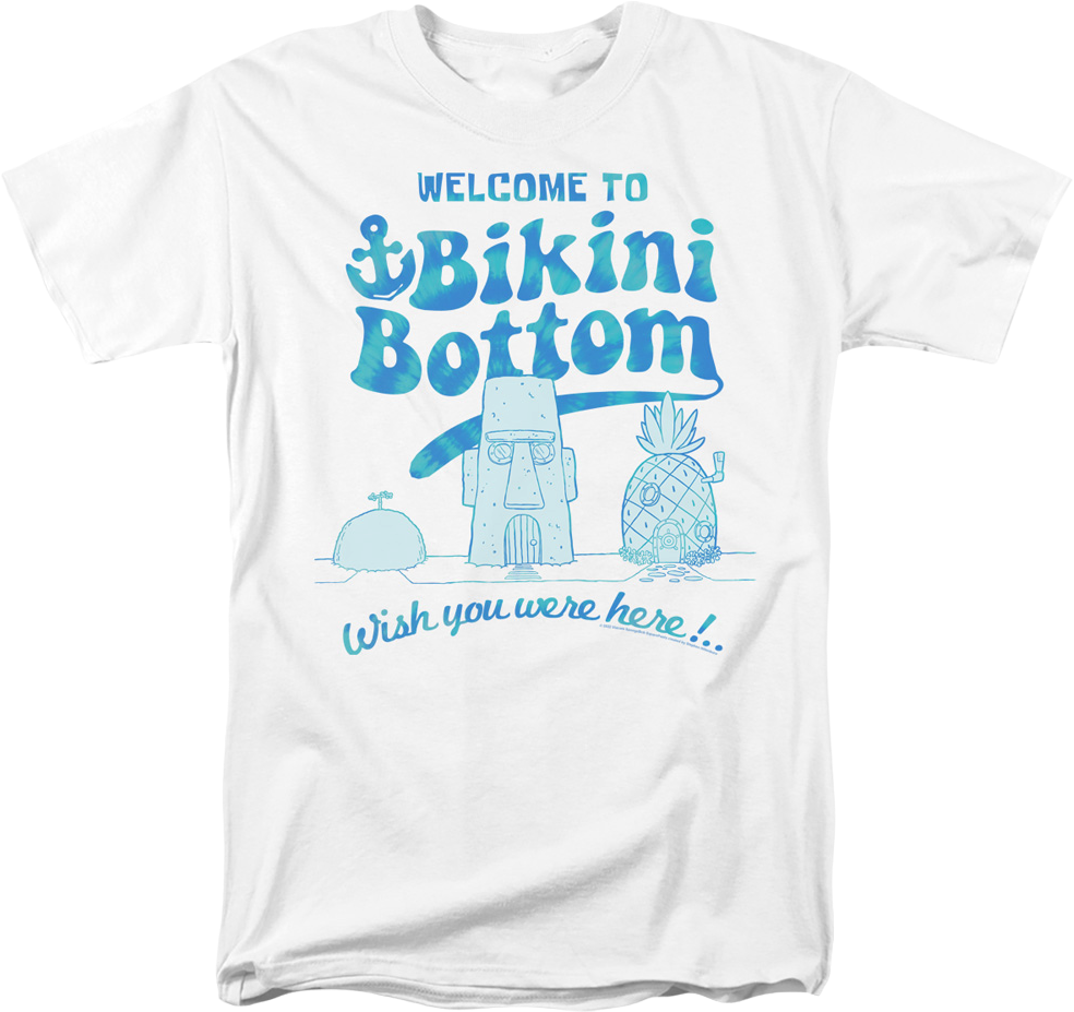This SpongeBob SquarePants t-shirt features a postcard for Bikini Bottom, an undersea city-state in the Pacific Ocean. Bikini Bottom is where SpongeBob and all of his friends live.