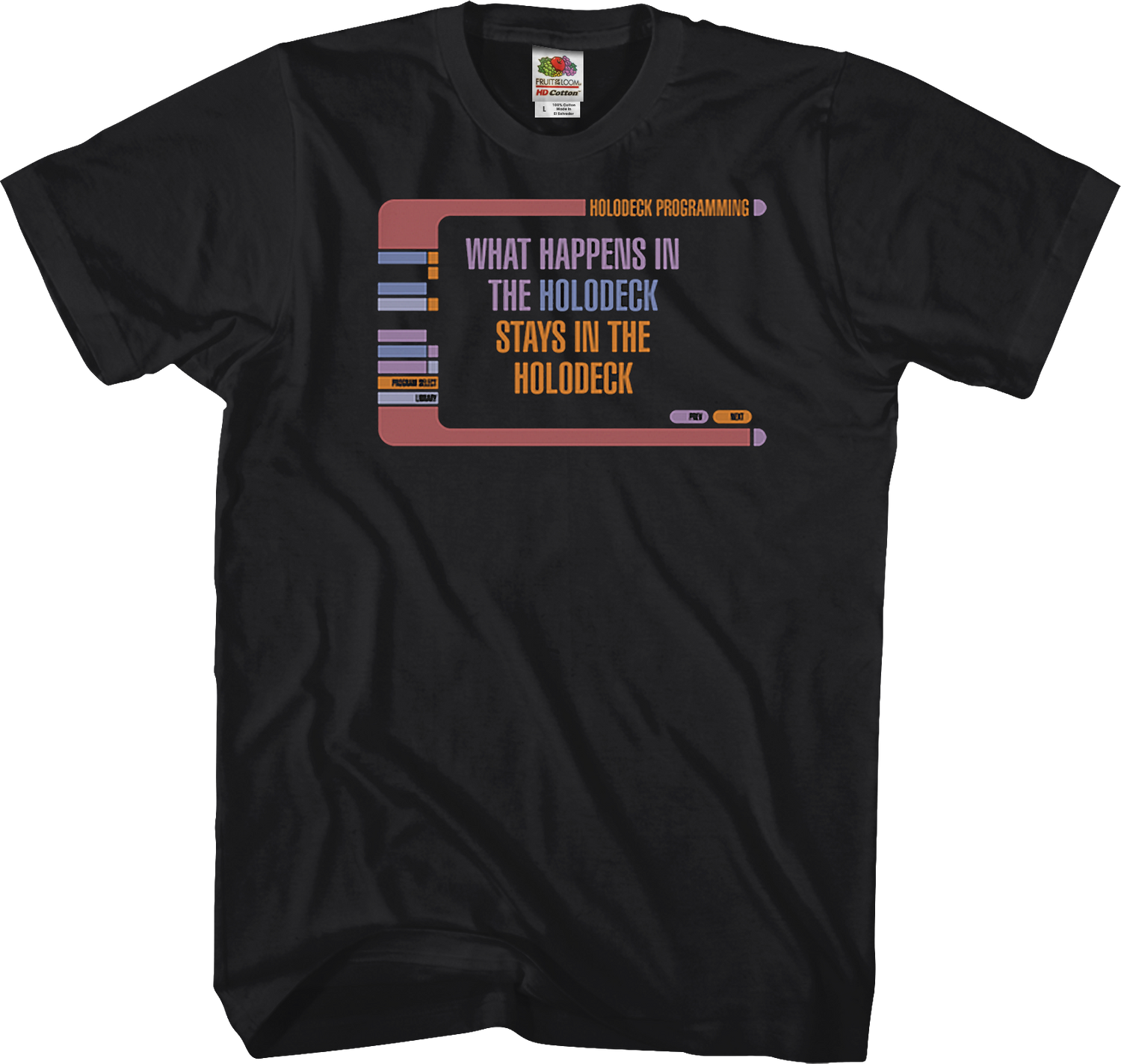 This What Happens In The Holodeck Star Trek The Next Generation T-Shirt shows the programming screen for the virtual reality simulator. Whether you want to get in some secret combat training time or load up some company to help with the lonely hours on board the ship, your secrets are safe inside the Holodeck.