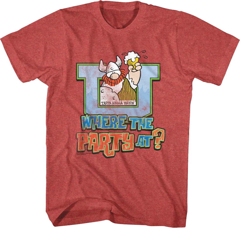 This t-shirt shows Hagar The Horrible raising a goblet of beer at the Tappa Kegga Brew fraternity. The shirt reads Where The Part At?