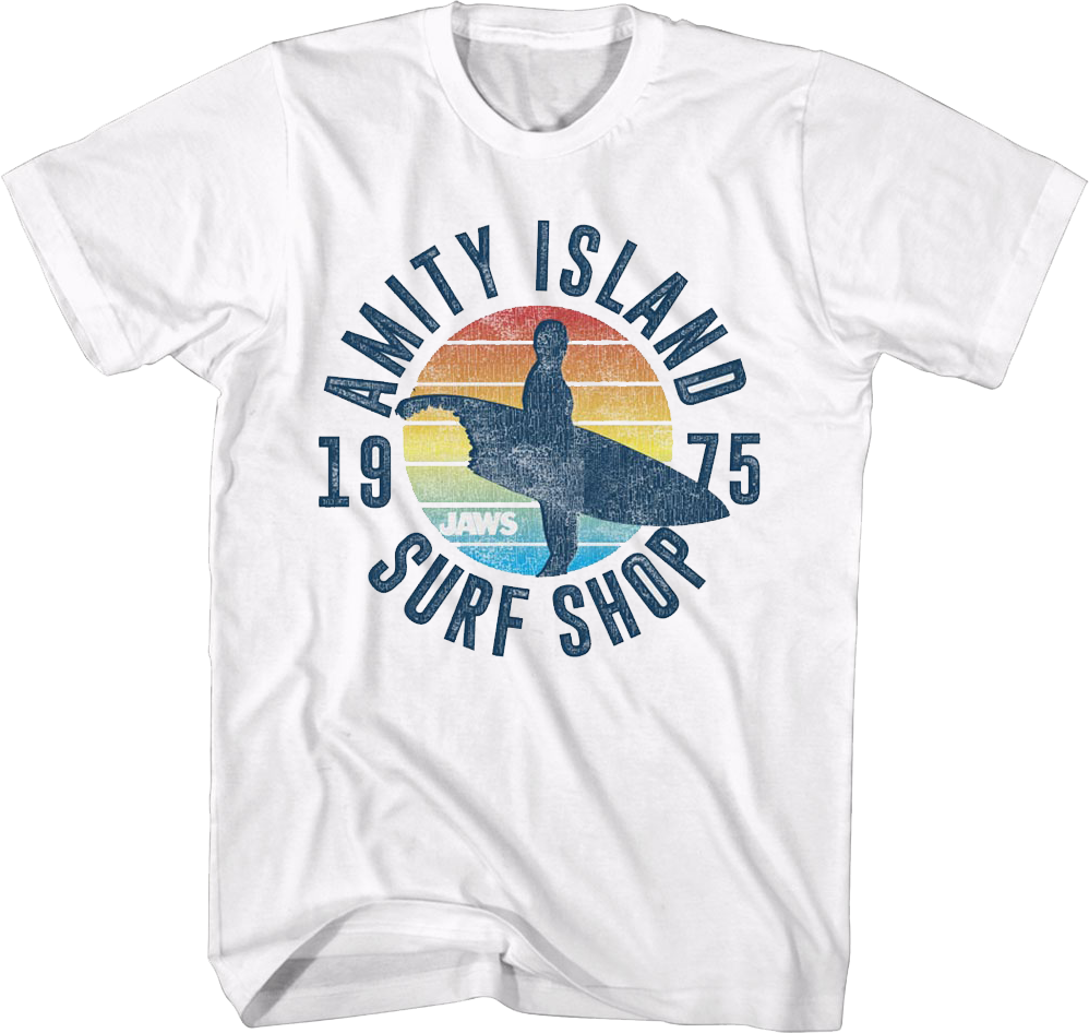 Steven Spielberg's terrifying classic Jaws is widely considered one of the greatest movies of all time. Everyone will immediately know that you are a fan when you wear this White Amity Island Surf Shop Jaws T-Shirt!