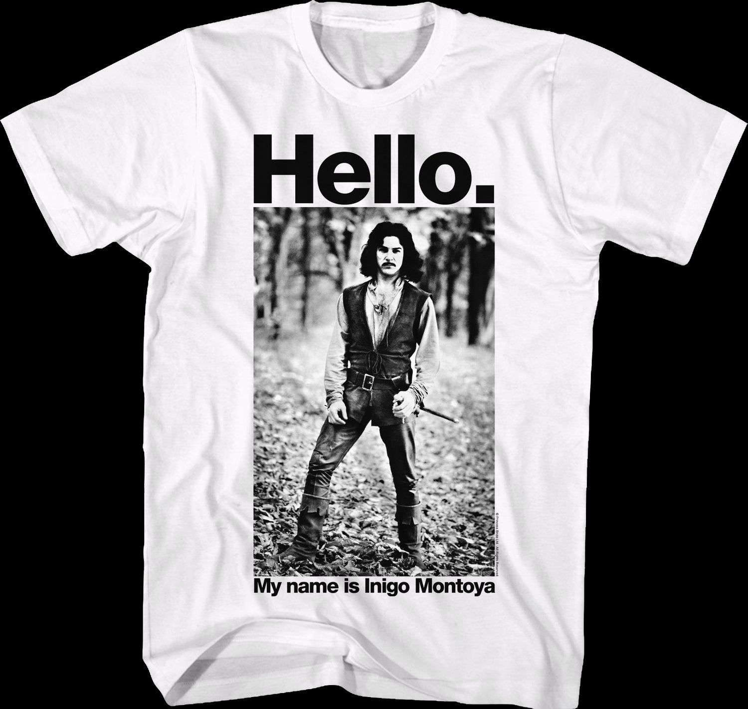 This Princess Bride t-shirt features a black and white image of the Spanish swordsman Inigo Montoya. The shirt reads Hello. My name is Inigo Montoya. This is the opening greeting to Inigo Montoya's catchphrase, and one of the most popular quotes in cinematic history, "Hello. My name is Inigo Montoya. You killed my father. Prepare to die". Everyone will immediately know that you are a fan of the 1987 classic The Princess Bride when you wear this White Inigo Montoya t-shirt!