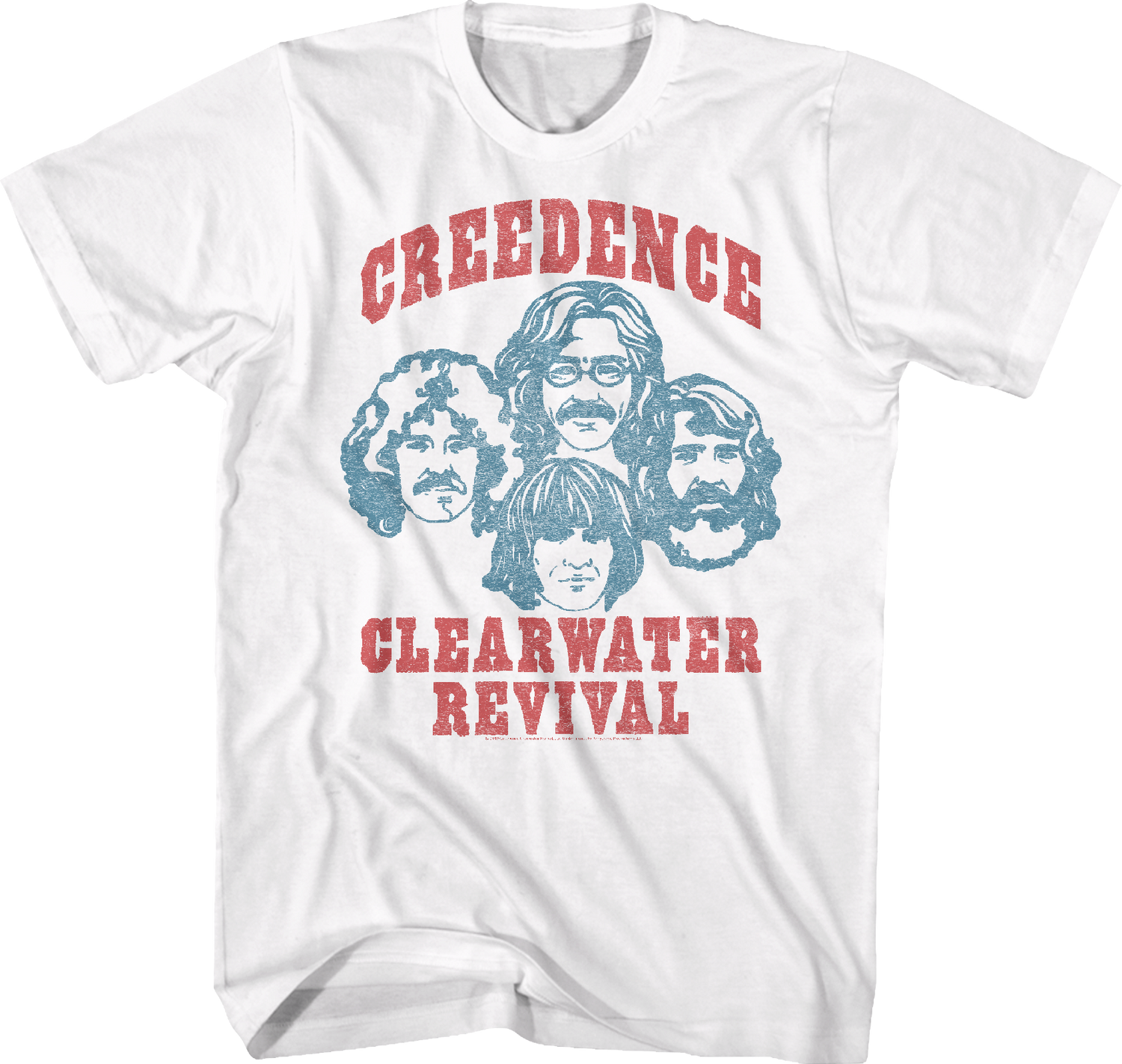 This Creedence Clearwater Revival t-shirt features sketches of band members John Fogerty, Tom Fogerty, Stu Cook and Doug Clifford.