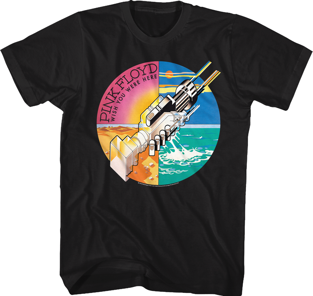 The vinyl for Wish You Were here was originally sold with a black cellophane sleeve that included a sticker designed by George Hardie. The sticker showed two mechanical hands in a handshake with four different images in the background. The image appears on this t-shirt.