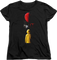 This womens Stephen King's IT shirt features the poster artwork for the 2017 version of the first chapter for the story of Pennywise the Dancing Clown terrorizing Derry, Maine. The poster artwork shows Pennywise holding out a red balloon to his first victim in the movie, Georgie Denbrough.