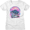 This womens Back To The Future shirt shows an airbrushed image of Doc Brown's DeLorean parked in front of the Hill Valley Courthouse and clock tower. The shirt shows the years 1955 and 1985.