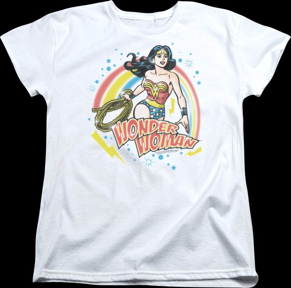 This womens shirt features an airbrushed image of Wonder Woman surrounded by stars, a rainbow, and lightning bolts.