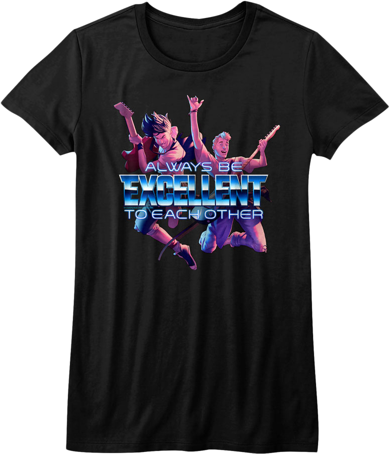 This Womens Always Be Excellent To Each Other Bill and Ted Shirt features an illustrated image of Bill and Ted playing their guitars in the band the Wyld Stallyns. Bill and Ted were two high school slackers who started their own rock band named the Wyld Stallyns. In the future, their music would be responsible for building a utopia. If the two teens didn't pass their history class, Ted would be sent to military school, forever erasing the music of the Wyld Stallyns. A man from the future named Rufus gave Bill and Ted a phone booth time machine so they could meet historical figures that would help them pass their history class, and help the Wyld Stallyns become a most triumphant band!