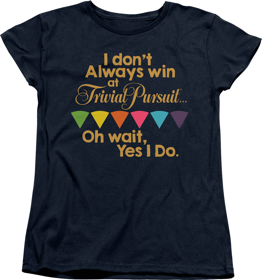 This womens Trivial Pursuit shirt reads I don't Always win at Trivial Pursuit...Oh wait, Yes I Do. The shirt includes the six colored wedges that players collect in the classic board game. The wedges represent the categories Geography, Entertainment, History, Art and Literature, Science and Nature, and Sports and Leisure. When a player lands on a category space, they'll earn the corresponding colored wedge if they answer the question correctly. The first player to collect 6 different colored wedges and answer a final question correctly wins. Show that you are the reigning champion of the trivia game that started it all with this Womens Always Win Trivial Pursuit Shirt!