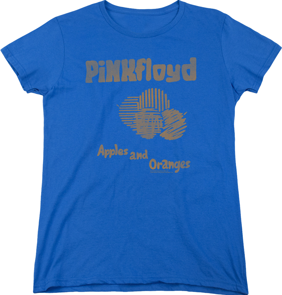 This women's Pink Floyd t-shirt features the cover artwork that appeared on the 45 record featuring the band's third single, "Apples and Oranges". Written by founding member Syd Barrett in 1967, it is one of few "love songs" performed by Pink Floyd. The premise of the song is simple: boy meets girl in a grocery store.