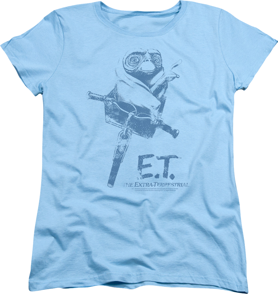 This womens ET shirt shows ET in Elliot's bicycle basket, wrapped up in a blanket, and ready for his iconic bike ride past a full moon.